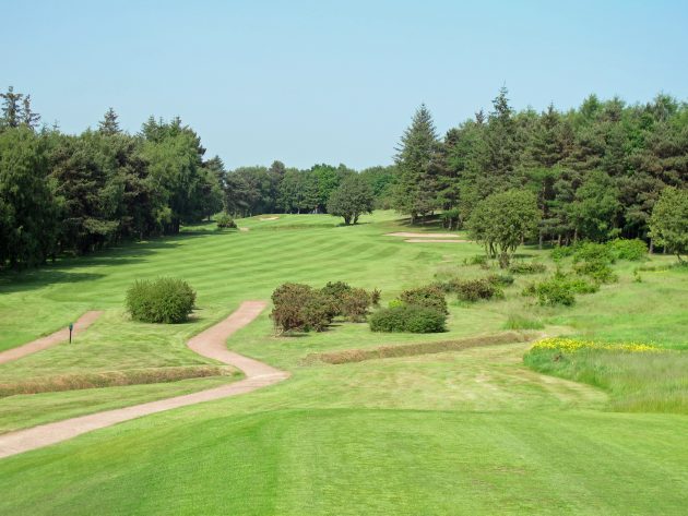Back to back par 5s offer the chance to pick up some Stableford points, and the front nine concludes with another very pretty hole, again with a ditch to cross, strong bunkering and a lovely backdrop of shrubs and Scots pine.
