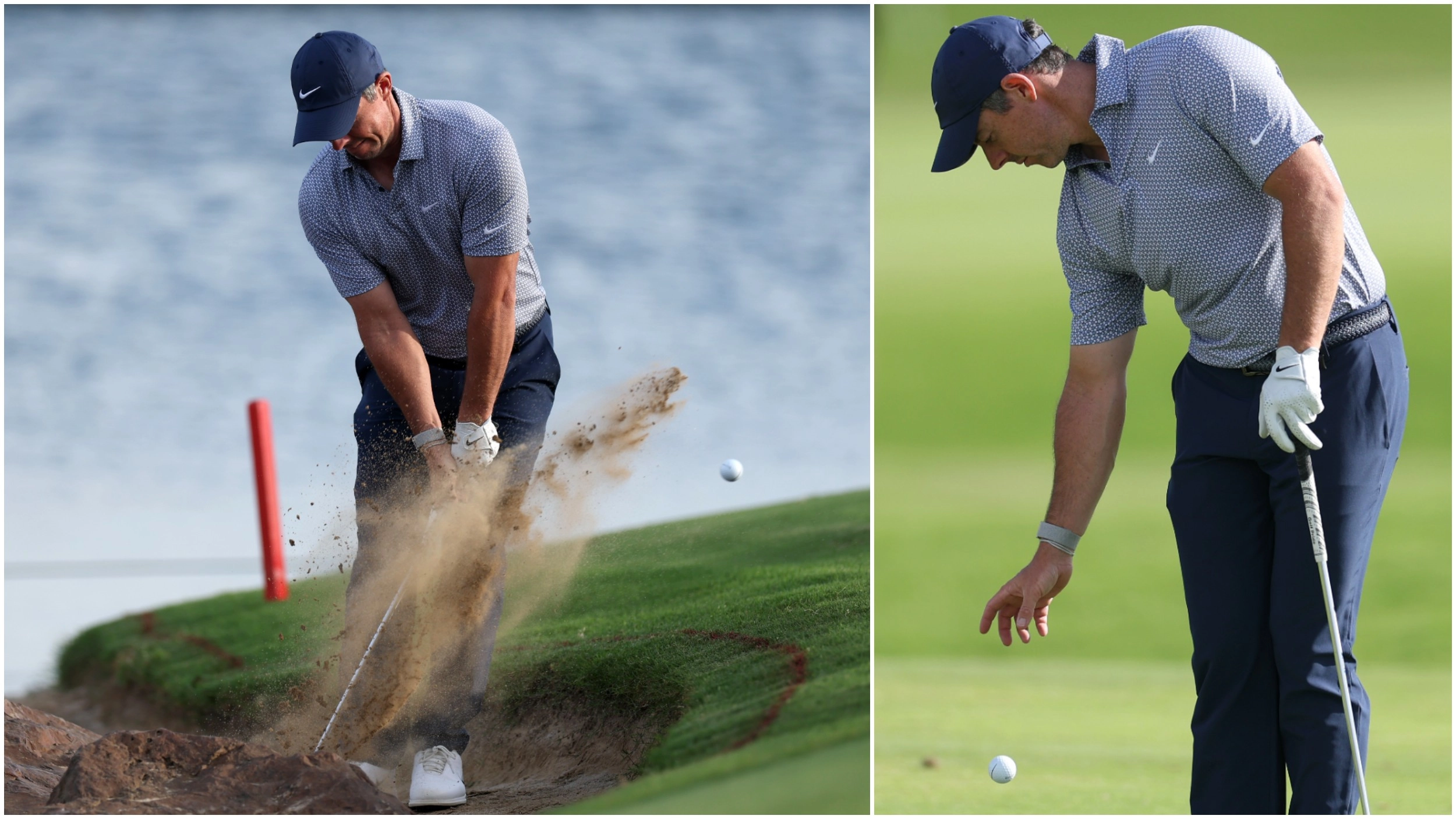 It was a much tougher day in Dubai due to the blustery winds blowing down around the UAE, resulting in McIlroy becoming all too familiar with taking a penalty drop, needing four of them - and only narrowly avoided making it five as he had to play a shot from the rocks at 18.